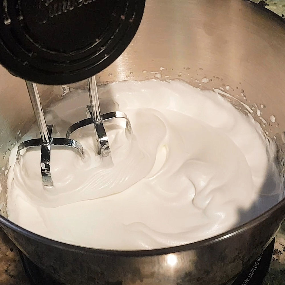 In a large bowl, add three egg whites, a pinch of salt and mix using a mixer until it turns foamy. It may take 4 – 5 minutes. Then add six tbsp of white granulated sugar, one tbsp at a time and half a tsp of vanilla extract. You should get a smooth creamy mixture.