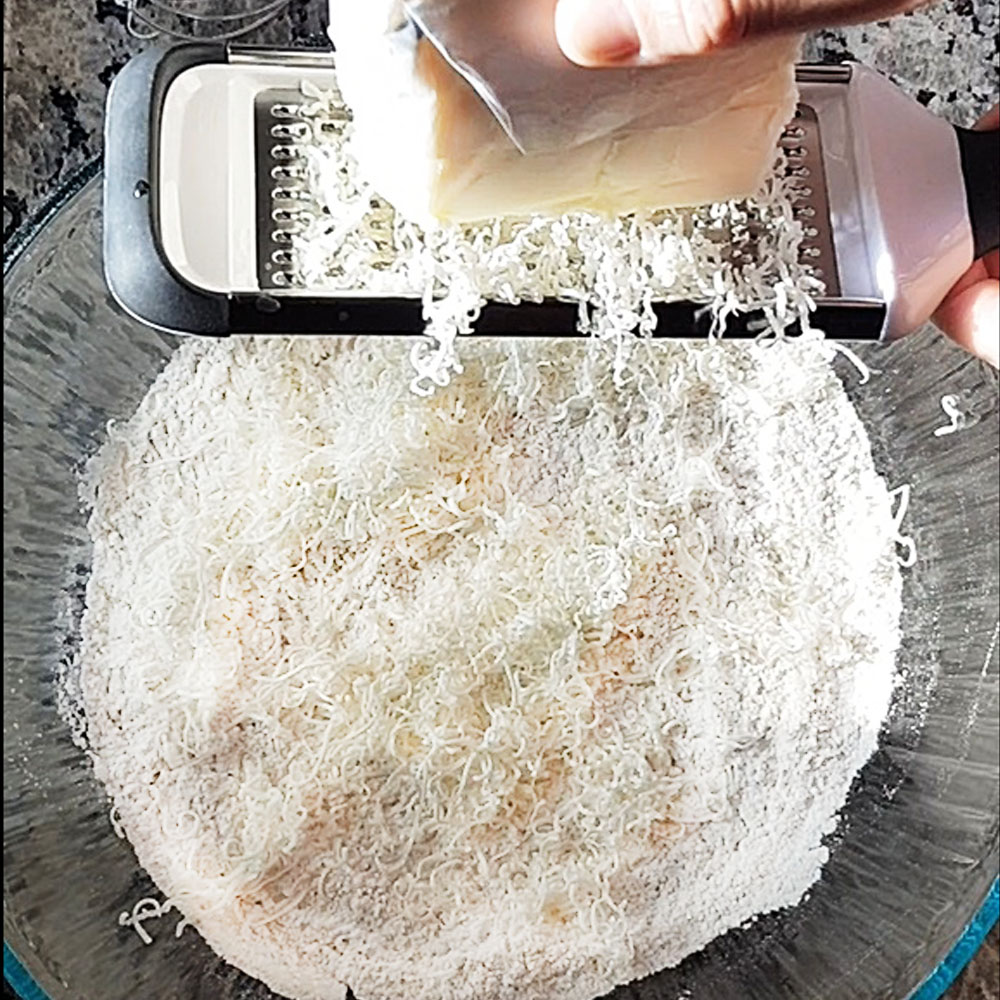 If using a food processor, slice one cup of unsalted butter into cubes and add to the food processor and mix until no clumps are visible. If doing by hand, freeze the butter and grate. Simultaneously whisk the butter to avoid clumps forming.