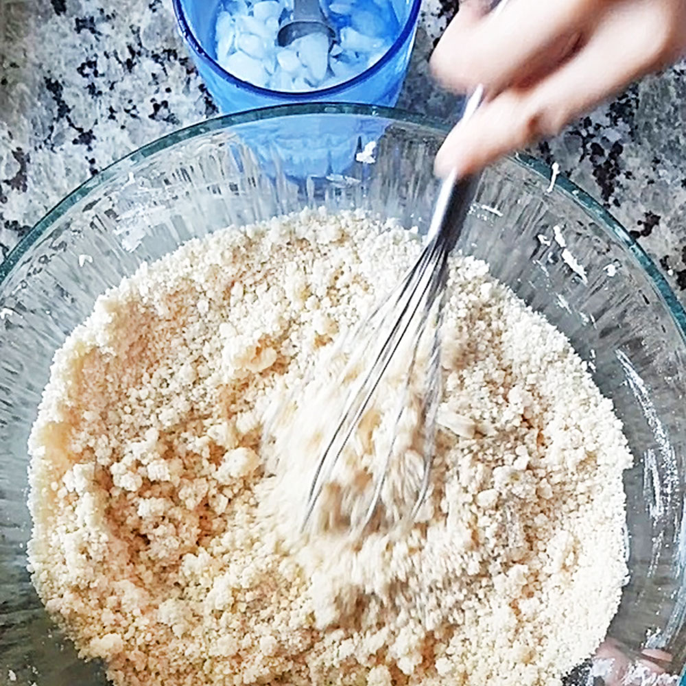 Add six tbsp of ice water and whisk thoroughly. Take some of the dough and press in your hand. If it forms a clump, then your dough is ready.