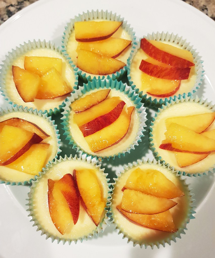 5. Bake the mini-cheesecakes at 350 F for 18 minutes. Once done, leave the tray to cool down for about 30 minutes. Add thinly sliced peaches or other fresh berries as a topping.