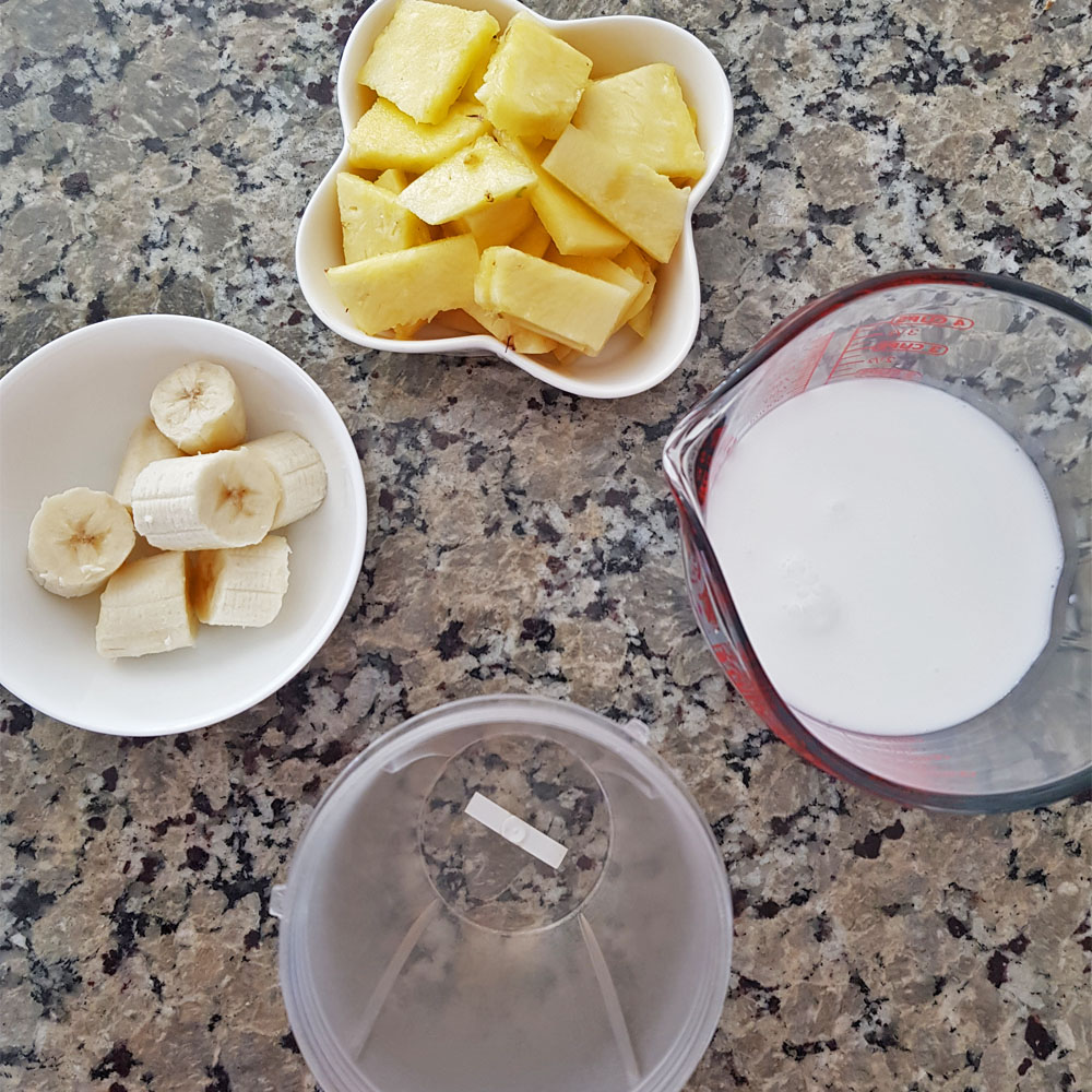 - Add the banana pieces, pineapple pieces and two cups of coconut milk into a container and blend.