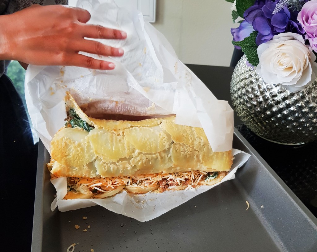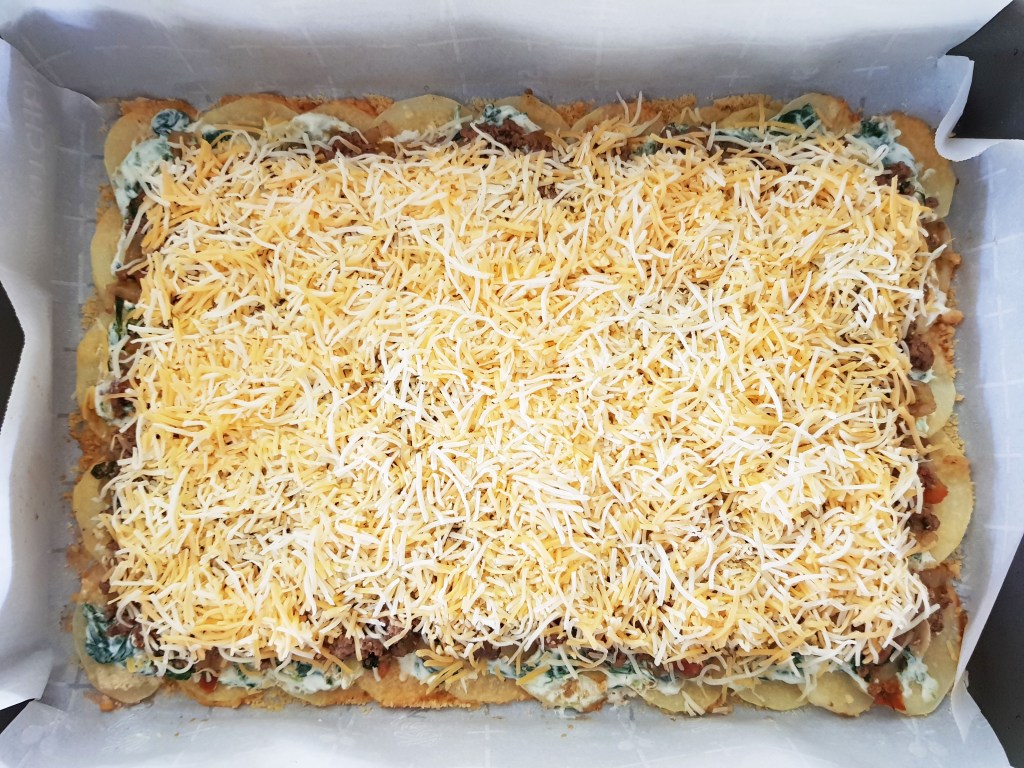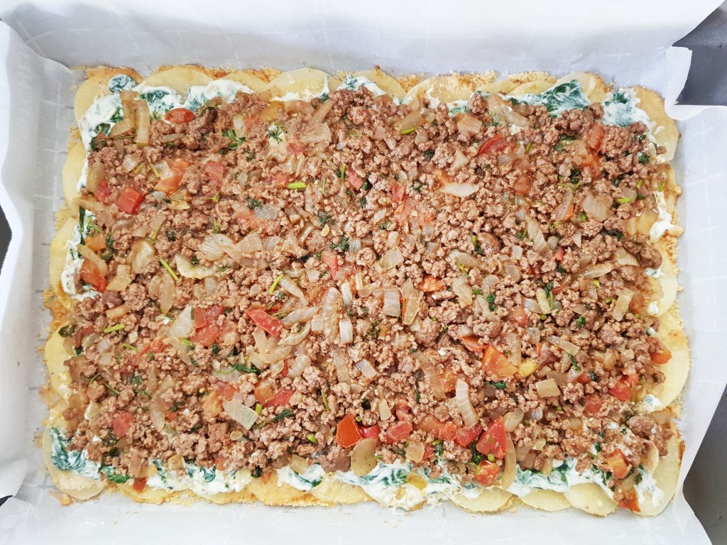 Cheesy baked scalloped potato roll with minced beef and creamy spinach filling. A winner at dinner parties!