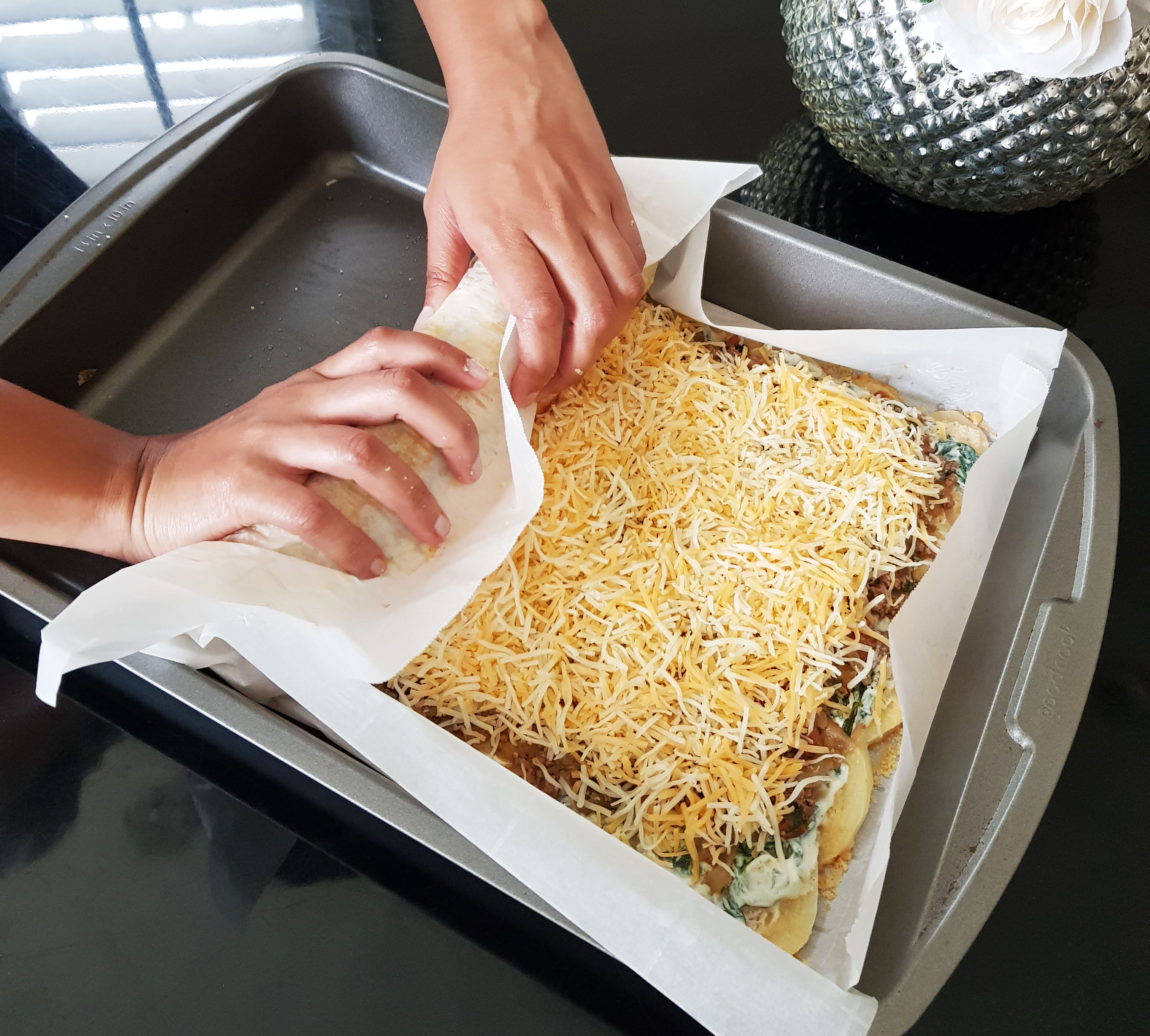 11. Fold the layers into a roll using the baking sheet.