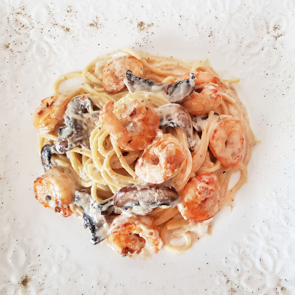 Add the pasta and shrimps and mix to coat with the sauce. Once your pasta & shrimps are well coated, turn the stove off. Your Shrimp Alfredo is ready to be served.