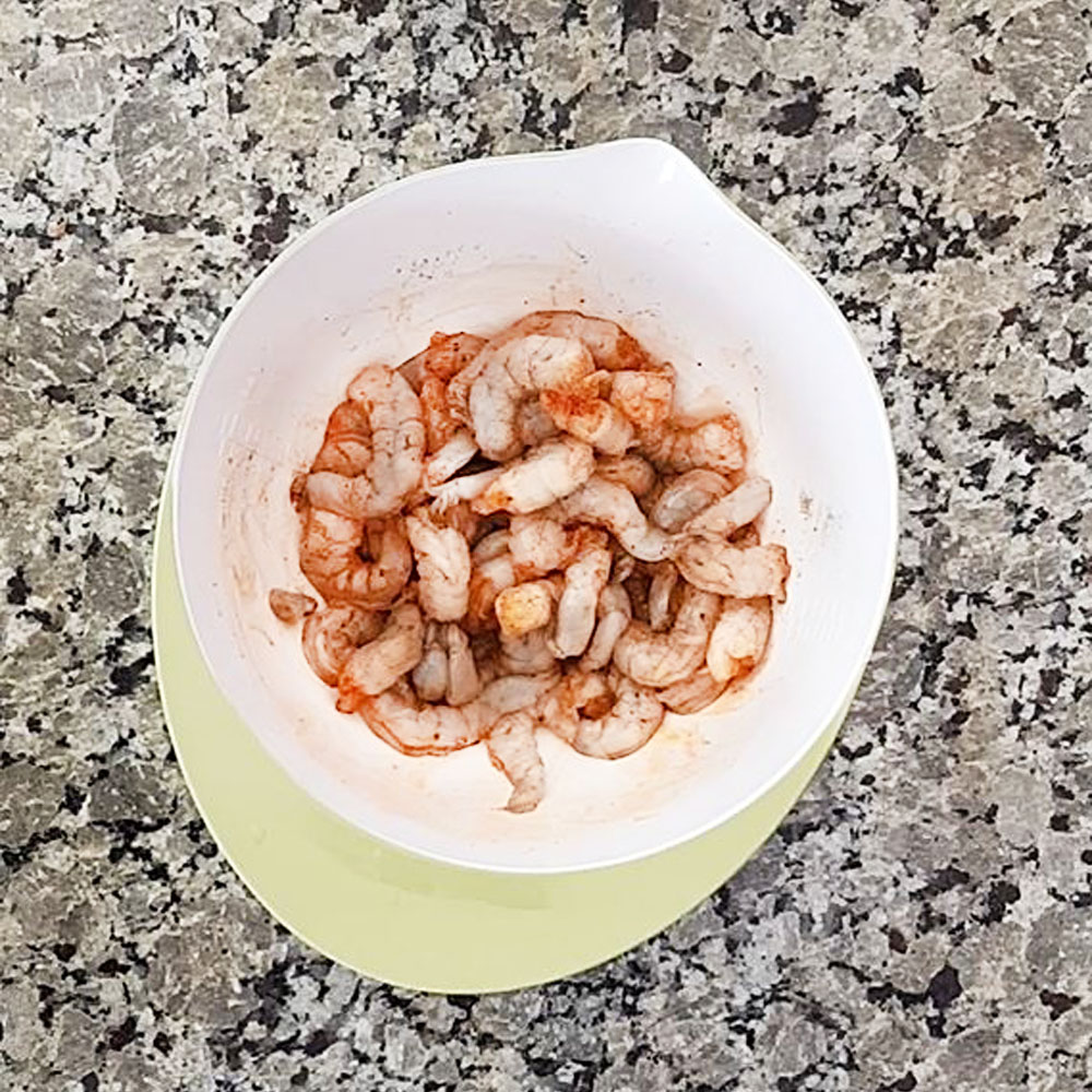 Wash and pat dry 1 lb of shrimp with paper towel. Marinate with half a teaspoon of salt, half a teaspoon of paprika and a quarter teaspoon of black pepper powder. Mix well.