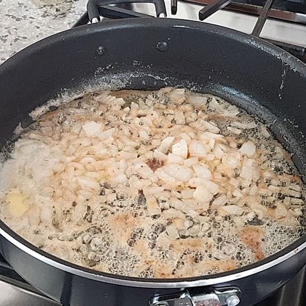 On the same pan over medium heat, add one-third cup of unsalted butter. Make sure to coat the pan with the butter, then add the chopped onions, stirring occasionally. After a minute, add the chopped garlic.