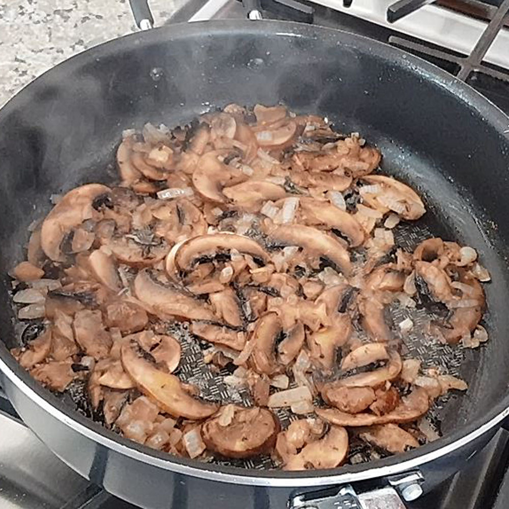 Once the onions have browned, add the sliced mushrooms. Cook until the mushrooms are tender and have turned brown. This should take about 4 – 5 mins.