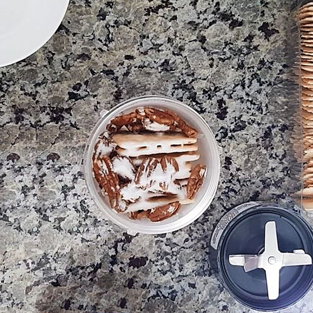 Using a blender or a food processor, mix 16 – 18 graham crackers, half a cup of toasted pecans and a quarter cup of sugar.