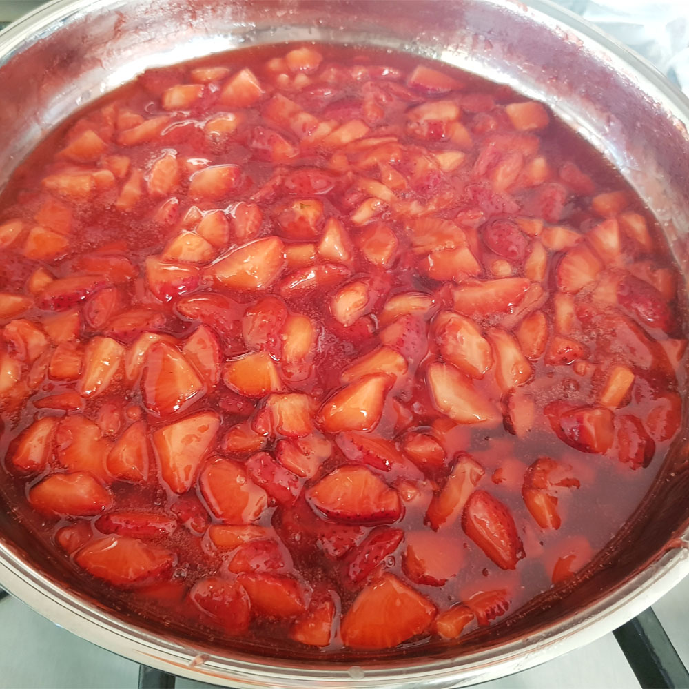 Get started on the strawberry sauce for the cheesecake topping while your cheesecake is baking. In a medium sized pan, add quarter cup of water, one tablespoon of cornstarch and one tablespoon of lemon juice and mix until the cornstarch is blended in. Do this before turning on the heat as the cornstarch will create clumps if the water is hot before it is mixed in. On medium heat, add three cups of diced strawberries to your mixture, half a cup of sugar and stir. Cook until the strawberries produce bubbles and the sauce has thickened.