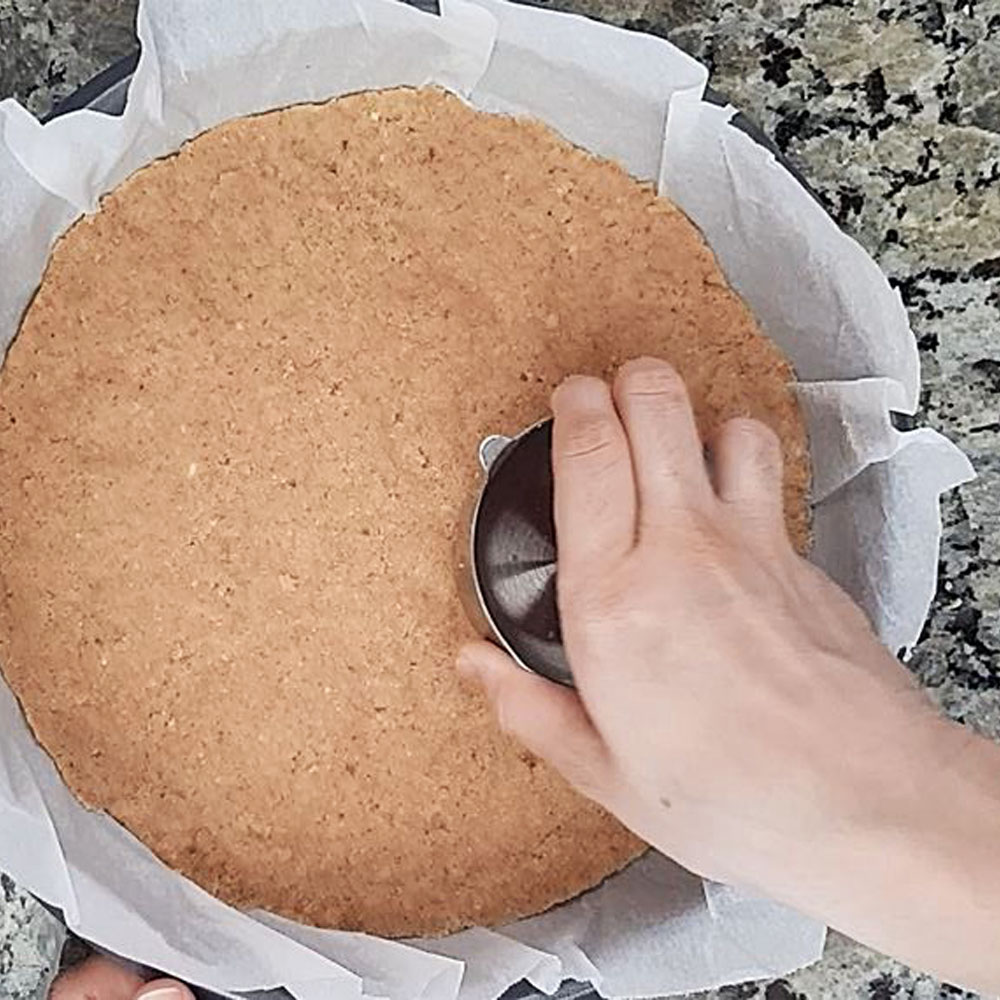 In a 9 inch springform pan, spread the crust mixture. Using a weight, press down on the mixture to help it settle into place. Preheat your oven to 350 F and bake the crust for 8 minutes.