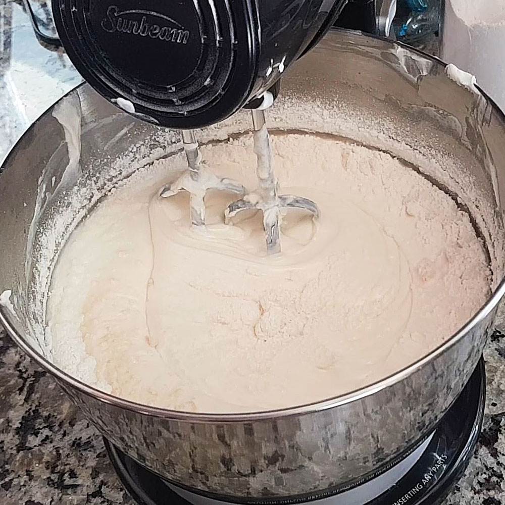 To get started on the cheesecake batter, add 32 oz of cream cheese at room temperature into a large bowl. Using a mixer, mix the cream cheese until it turns creamy. This should take a couple of minutes. Then add one and a half cups of sugar and continue mixing. Once the sugar is incorporated in, add two-thirds cup of sour cream. Make sure to stop the mixer and scrape the sides and middle after each addition to ensure all ingredients are evenly blended. Once the sour cream is blended in, add half a teaspoon of salt and two teaspoons of vanilla extract. Then add three tablespoons of all purpose flour.