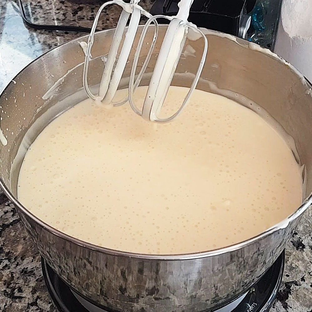 Once the ingredients have been incorporated in, add four large eggs and two egg yolks at room temperature one at a time. Wait for each egg to mix in before adding another. Once all the eggs are mixed in, your cheesecake batter is ready.