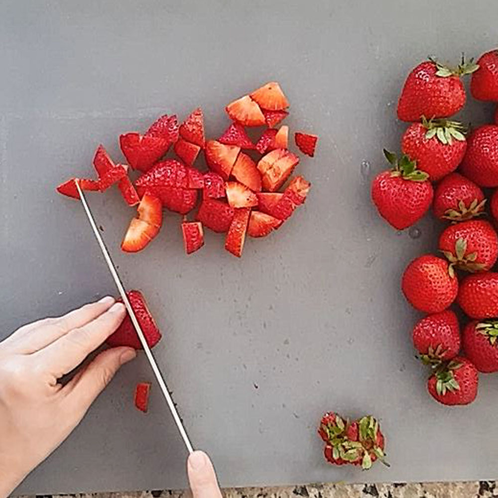 Dice strawberries amounting to one cup for the cheesecake filling and three cups for the strawberry sauce.