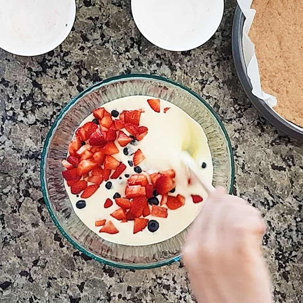 Pour half of the cheesecake batter into another bowl and mix in one cup of diced strawberries and one cup of blueberries.