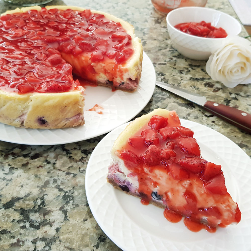 On the baked crust, pour the cheesecake batter containing berries first, then add the remaining half of the cheesecake batter. Make sure all of the berries have sunk to the bottom. If needed press on any floating berries with a spatula. Bake at 350 F for 10 minutes then without opening the oven, reduce the temperature to 300 F and bake for an additional 50 minutes.