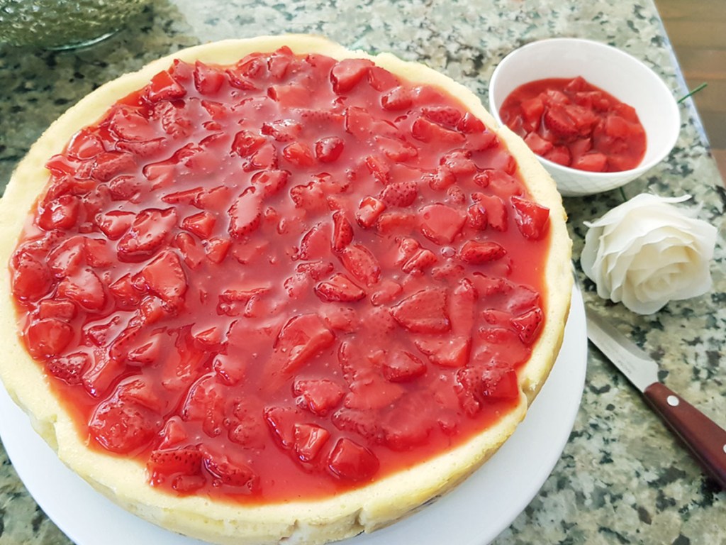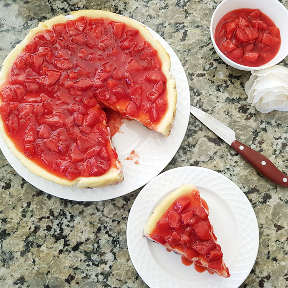 On your chilled cheesecake, pour the cooled strawberry sauce and serve. Tip: Dip your knife into hot water before slicing into the cheesecake for a smoother cut. This way the cheesecake wont stick to your knife.